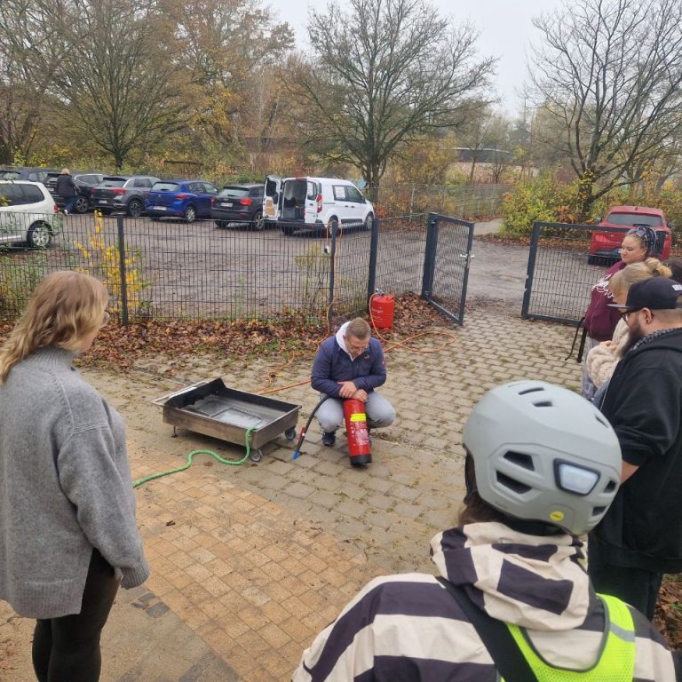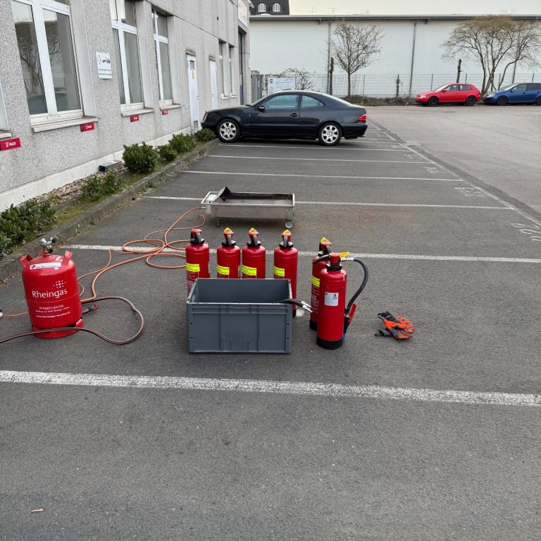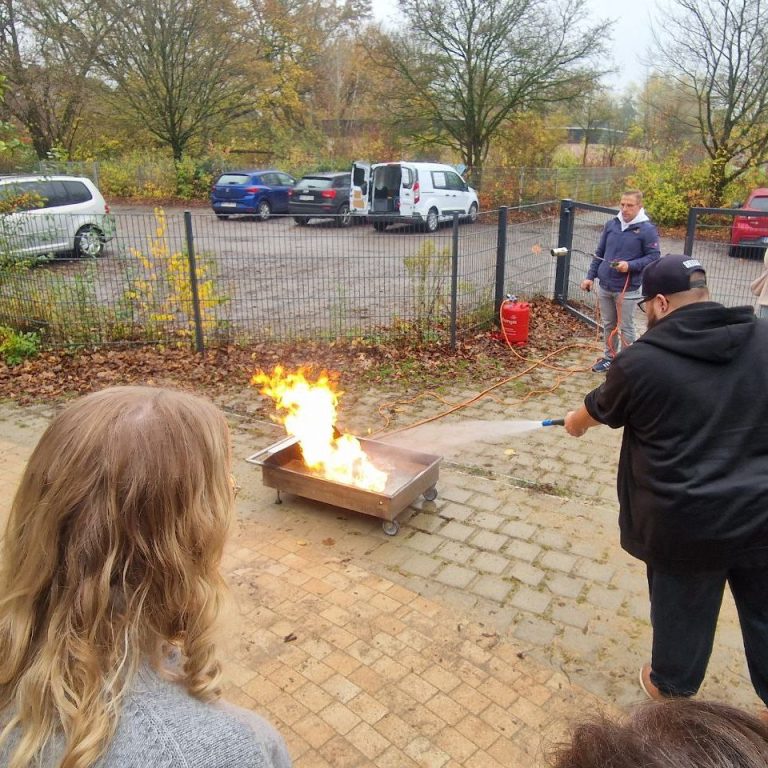 Handhabung von Feuerlöschern, Löschtaktik und praktische Übung mit ausreichend Zeit für jeden Teilnehmenden.
